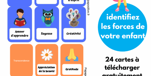 Les recherches en psychologie positive ont permis de déterminer 24 forces réparties en 6 vertus. Nous possédons tous ces forces plus ou moins développées. Mais il est possible d’y travailler ! Ce travail est d’ailleurs d’autant plus intéressant avec les enfants. En effet, en remarquant quand leurs forces s’expriment, ils renforceront leur confiance en soi … Lire la suite de 24 cartes pour aider les enfants à développer leurs forces
