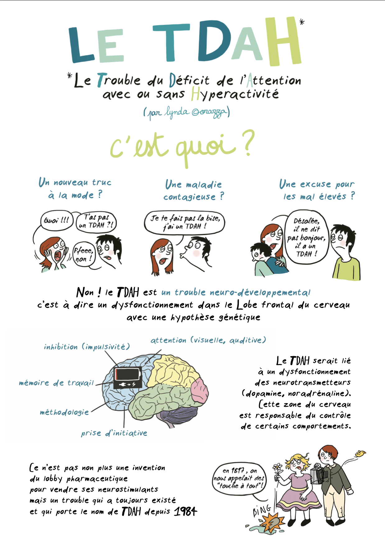 Il présente de manière claire et synthétique le Trouble Déficit de l’Attention avec ou sans Hyperactivité (TDAH) en expliquant ses trois caractéristiques principales : l’inattention, l’impulsivité (verbale, motrice et sociale) et l’hyperactivité.