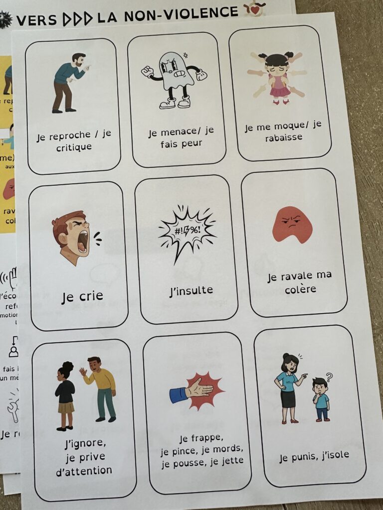 Il est composé d’une affiche principale, de cartes émotions, de feuilles de travail, d’une roue des émotions et des besoins,…